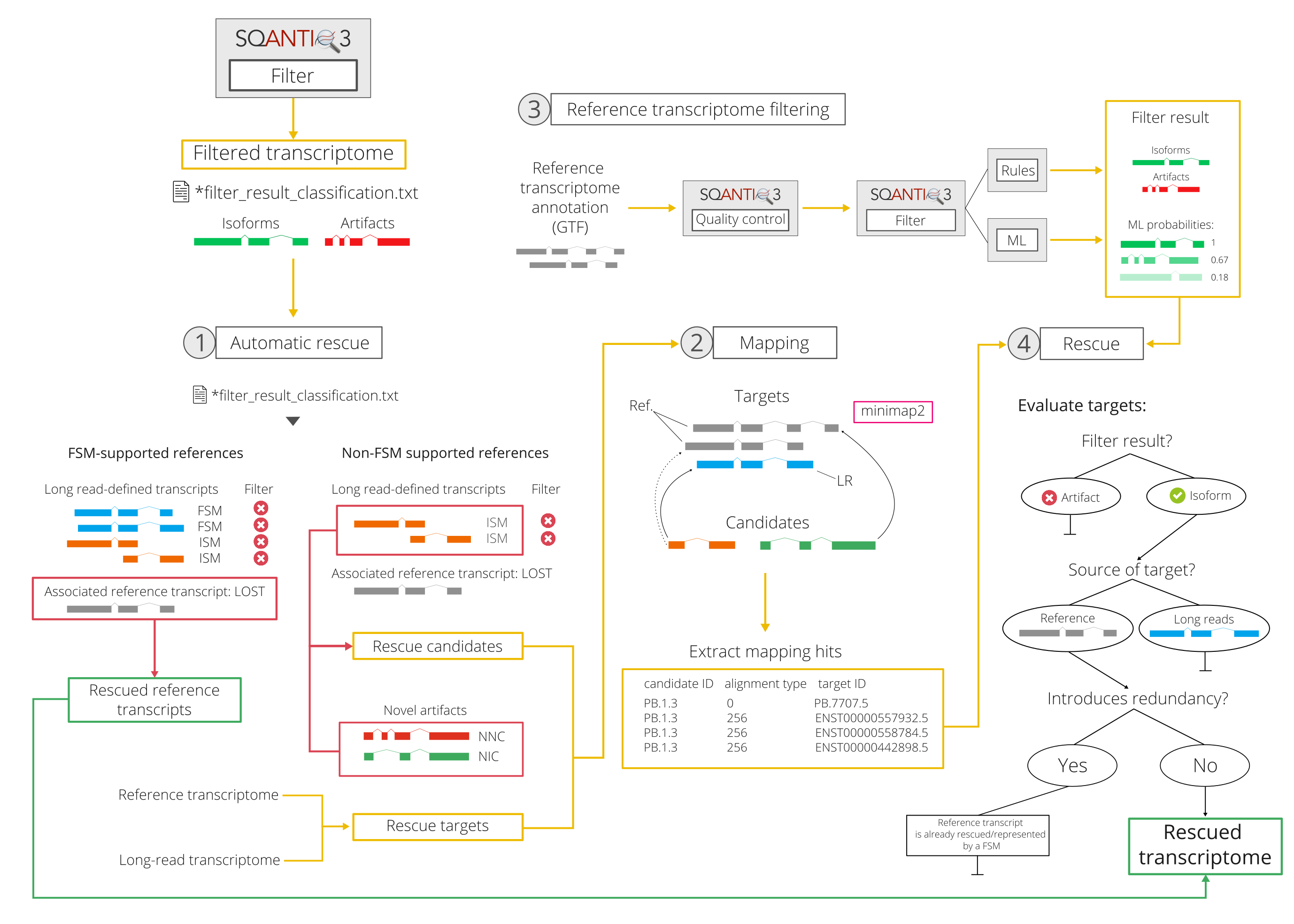 In particular, during the rescue, SQANTI3 will try to confidently assign each discarded artifact to the best matching reference transcript. As a result, SQANTI3 rescue will generate an expanded transcriptome GTF including a set of reference transcripts as well as the long read-defined isoforms that passed the filter. Optionally, requantification can be performed to reassign expression values to the rescued isoforms.