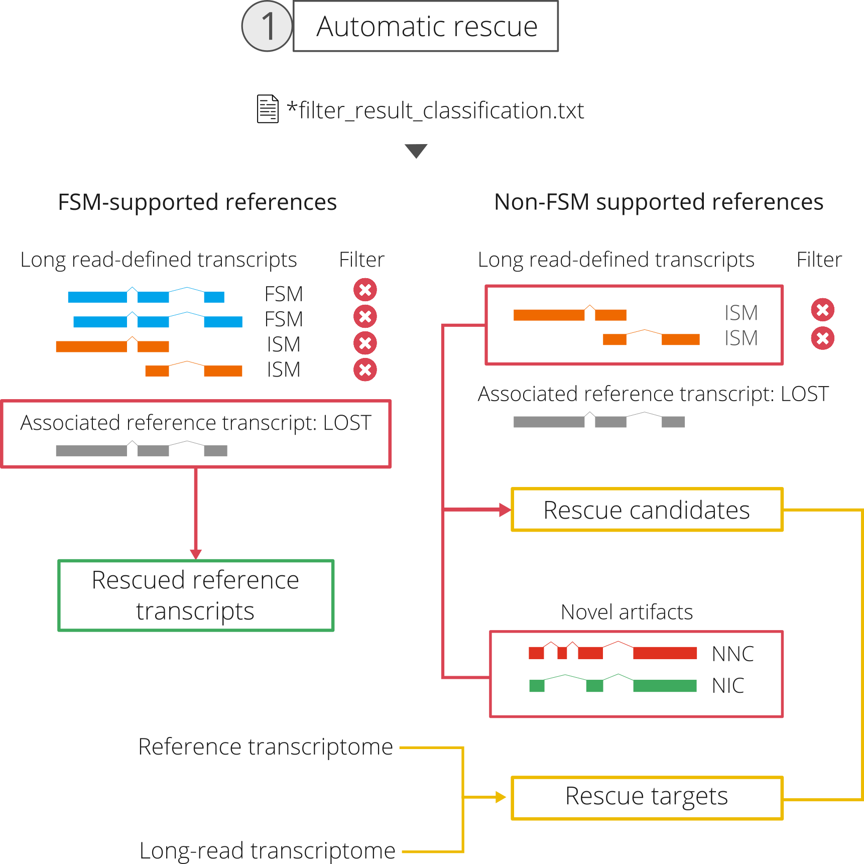 In spite of its potential to achieve the goals that we set for the rescue, the previous strategy does not consider ISM, NIC or NNC artifacts. These will be included in the rescue candidate group, i.e. transcripts classified as artifacts for which SQANTI3 will try to find a matching reference transcript to include in the final, curated transcriptome.