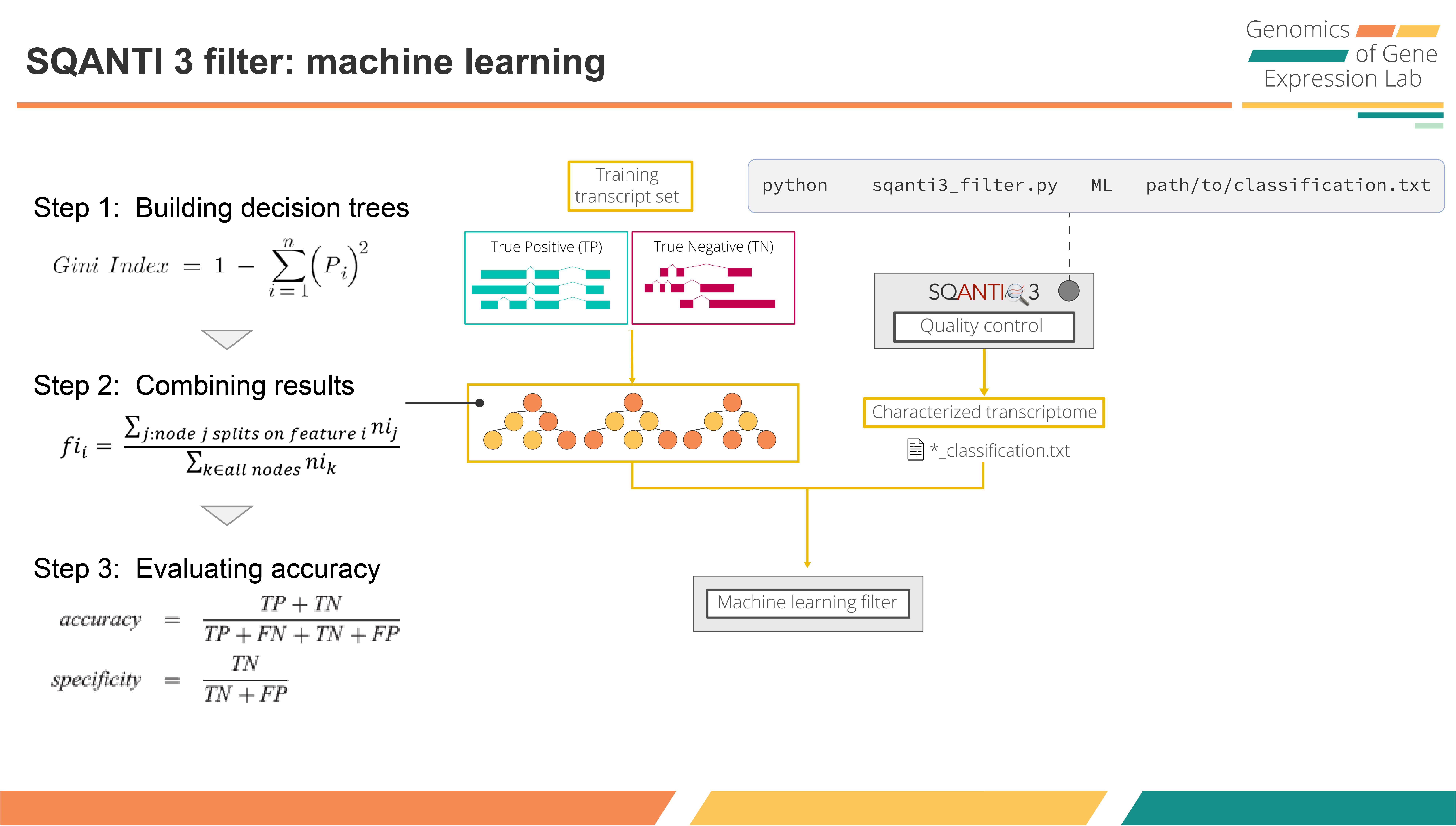 Before training the model, it’s important to divide the dataset into training and testing sets. Typically, 80% of the data is used for training, while the remaining 20% is set aside for testing. This approach allows the model to learn from the majority of the data while still being evaluated on data it hasn’t seen before, giving a clearer picture of how well it generalizes. To further strengthen the model’s reliability, SQANTI3 uses a 10-fold cross-validation technique during training. This means the training data is split into 10 equal parts—nine are used to train the model, and the remaining one is used for validation. This process repeats 10 times, cycling through each part. The goal is to reduce overfitting and ensure the model performs consistently across different subsets of data.
