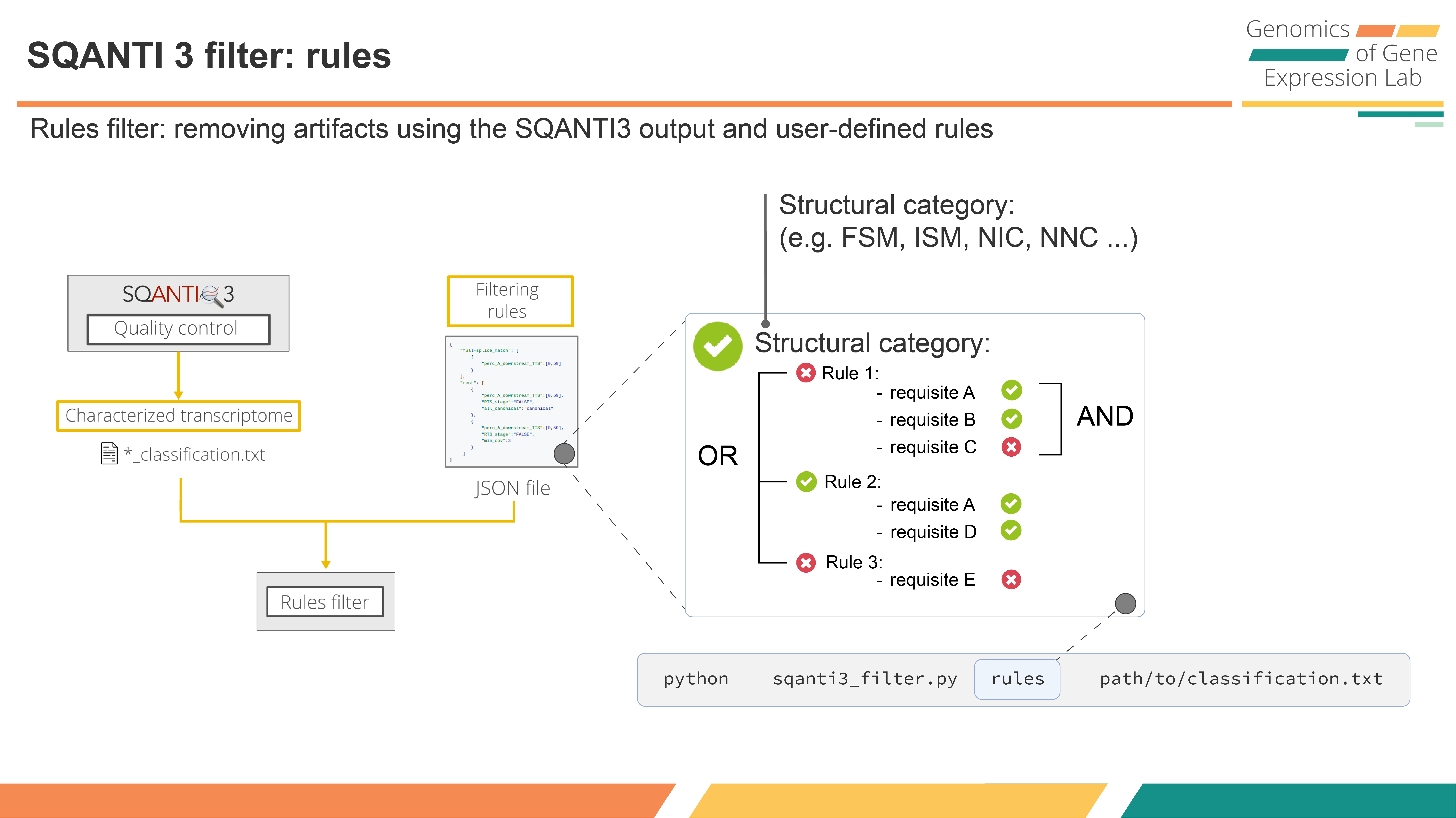 • The SQANTI3 QC and Filter modules (machine learning or rules) are applied on the reference transcriptome, ensuring the same data and quality standards as were used for the long-read transcript models.