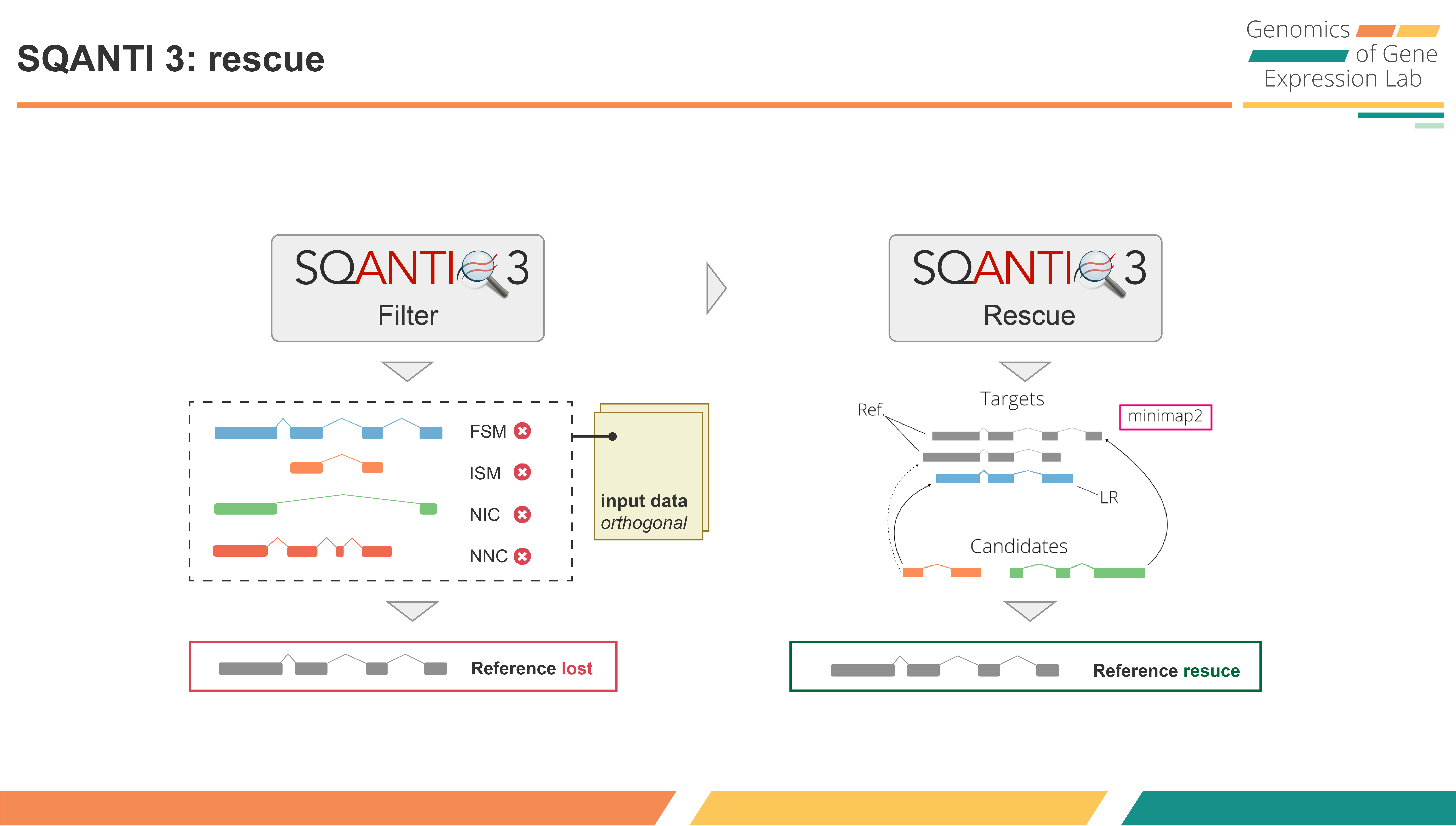 SQANTI3 rescue offers two main modes of operation: automatic and full. The automatic mode, which is the default, focuses on recovering high-confidence reference isoforms by identifying reference transcripts for which all corresponding Full Splice Match (FSM) isoforms were removed during the filtering stage, under the assumption that their junction structures are likely correct. On the other hand, the full mode extends the rescue process to consider ISM, NIC, and NNC artifacts as rescue candidates. This mode involves a more comprehensive strategy, including mapping these candidate artifacts to potential target transcripts from both the reference and long-read datasets using minimap2, followed by applying the SQANTI3 filter to the reference targets and a final selection of rescued transcripts based on the mapping results and filter outcomes.
